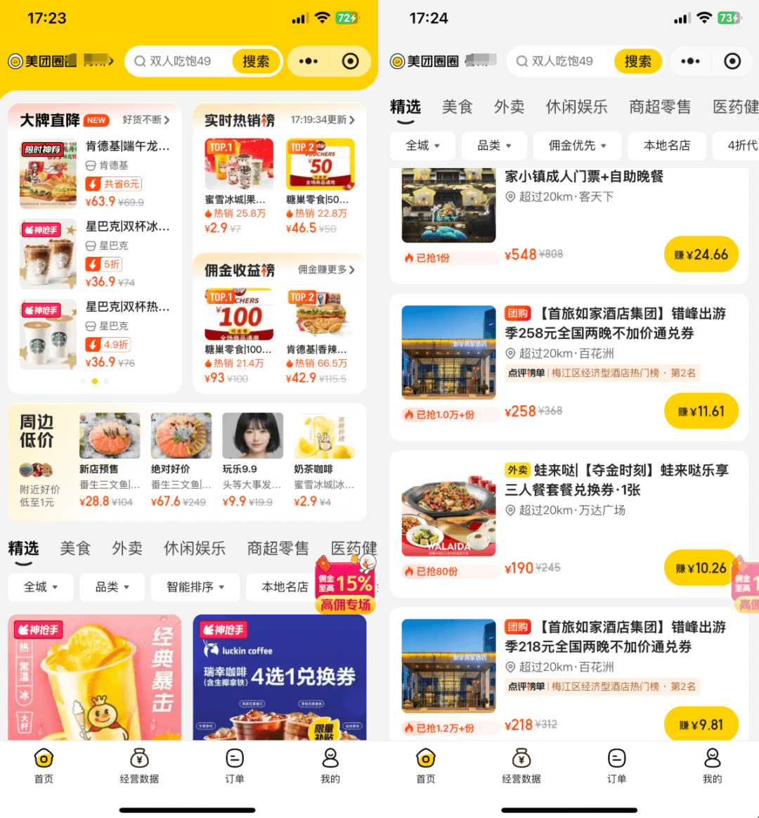 比如说,美团圈圈这个平台,只要注册成达人,就可以拿到返佣,这就跟以前做淘宝联盟一样,你帮美团卖券,他们就给你佣金,我卖出去一张券,可能美团就给我返10块钱,我再在闲鱼卖贵一点,就又能多赚几块。