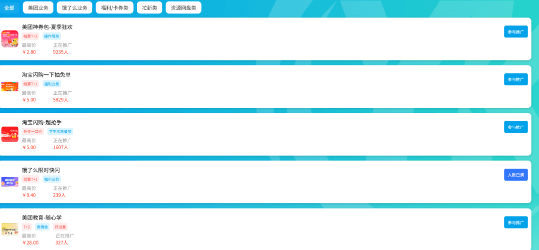 通过之后,里面的项目很多,主流的三家外卖推广都有。