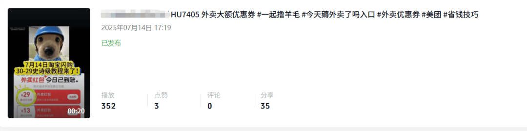 现在这个项目正值红利期,三家外卖大战,美团、饿了么、淘宝都在发券,平台推广预算猛砸,只要你视频能起量,钱是真的好赚。