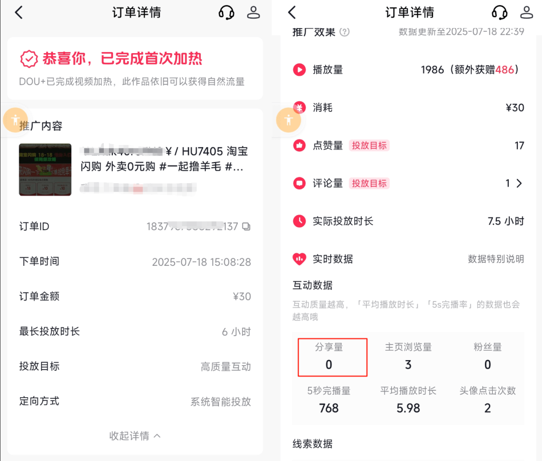 我前几天也实测了一下,用抖音的抖+试着投流,新用户只要30块就能投,我想着试试看,结果数据老惨了:2000播放、17个赞、一个评论、0转发。